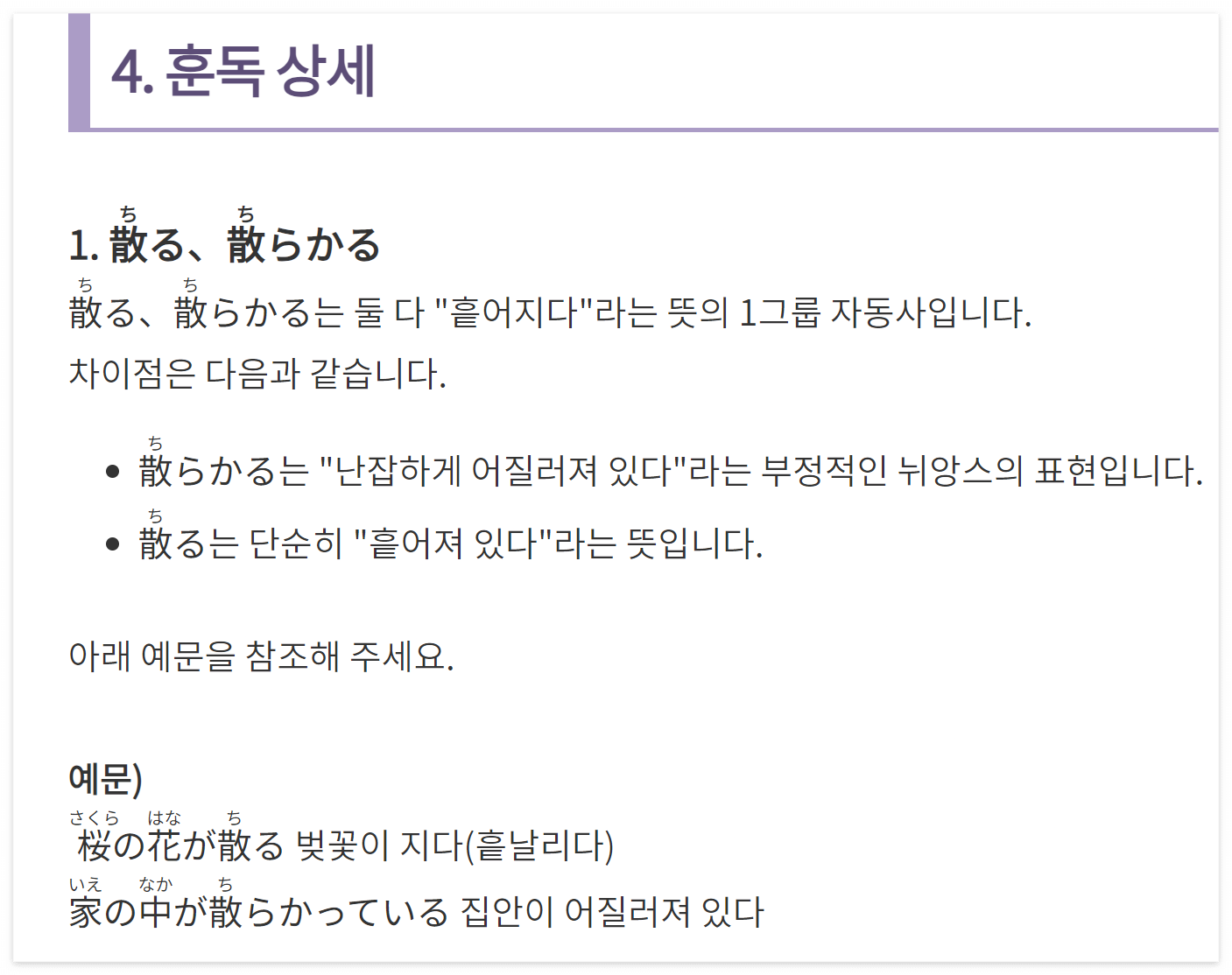 각 훈독에 관한 자세한 설명과 예문이 함께 제시되어 있습니다.