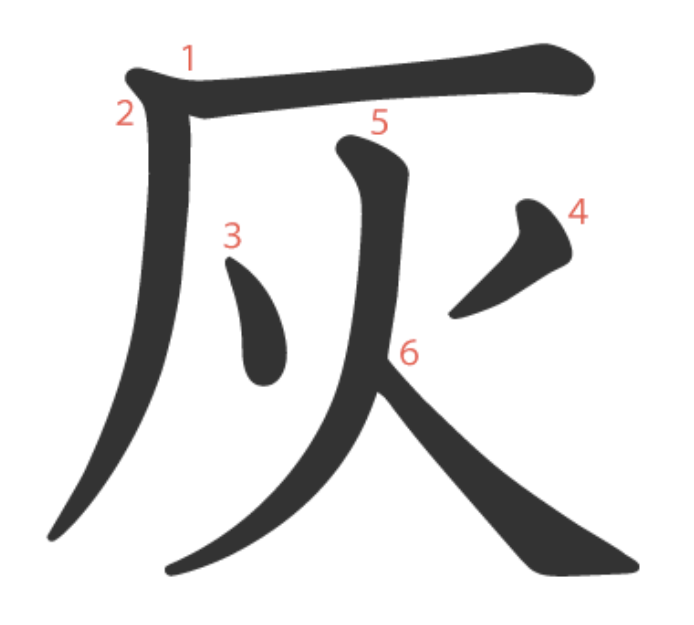 灰는 "아궁이(厂)의 불(火)이 타고 남은 재" -> "재, 잿더미"라는 뜻의 글자입니다.