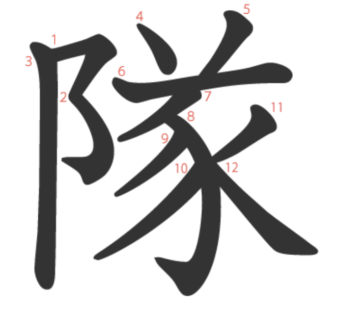 隊는 "산속(⻖)의 수풀(丷) 사이로 몰려다니는 멧돼지(豕) 무리" -> "무리, 조직, 떼"라는 뜻의 글자입니다.
