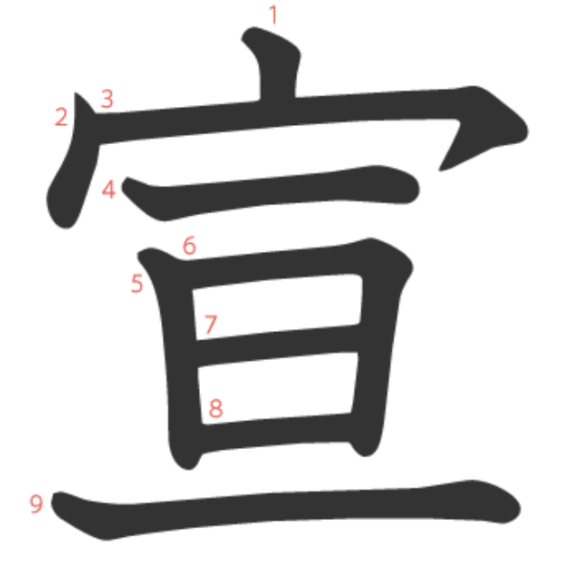 宣는 "황궁(宀)에서 반포한 칙명이 천지(亘)로 퍼져나가다" -> "널리 퍼지다, 선언하다"라는 뜻의 글자입니다.
