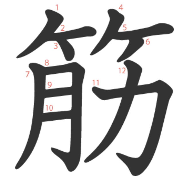 筋는 "대나무 마디(竹)처럼 잘 갈라진 신체(月)의 근육(力)" -> "근육, 힘줄"이라는 뜻의 글자입니다.