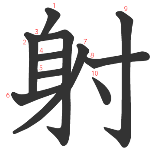 射는 "몸(身)에 든 활(寸)을 쏘다" -> "쏘다"라는 뜻의 글자입니다.