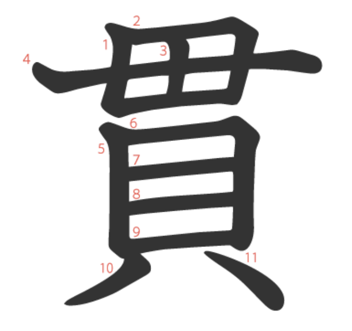 貫는 "동전(貝)을 한 줄로 꿰어놓다(毌)" -> "꿰다, 관통하다"라는 뜻의 글자입니다.