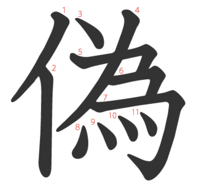 偽는 "다른 사람(亻)을 사칭하여 행동하다(為)" -> "거짓, 가짜"라는 뜻의 글자입니다.