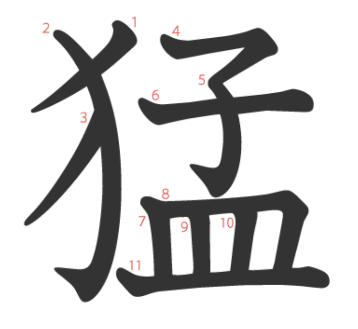 猛는 "아이(子)가 사나운 개(犭)에게 물려 피(血)를 흘리다" -> "거칠다, 사납다"라는 뜻의 글자입니다.