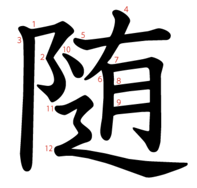 随는 "험준한 산(⻖)까지 따라 올라오는(⻌) 충실한 수행원이 있다(有)" -> "따르다, 순응하다"라는 뜻의 글자입니다.