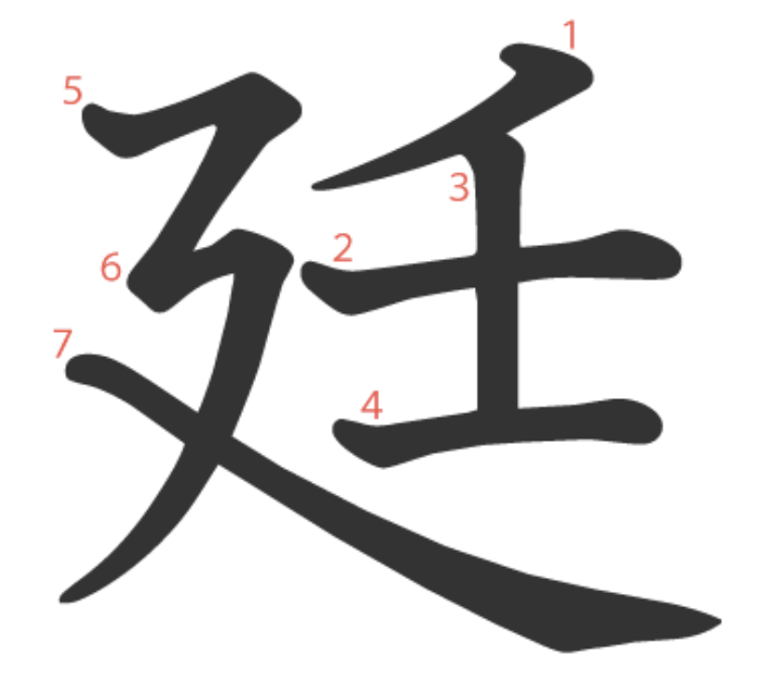 廷는 "관청의 복도(廴)를 휘적휘적 걷는 사람(壬)" -> "법정, 조정, 관아"라는 뜻의 글자입니다.