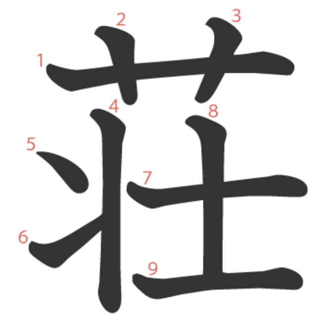 荘는 "장엄하게(壮) 펼쳐진 초원(艹) 위의 별장" -> "장엄하다, 별장"이라는 뜻의 글자입니다.