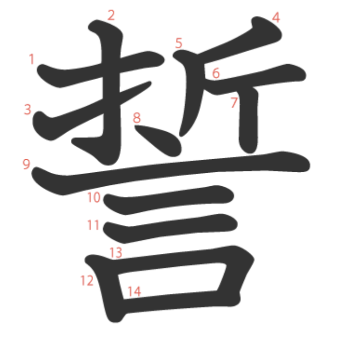 誓는 "도끼(斤)를 손(扌)에 들고 충성을 맹세하다(言)" -> "맹세하다, 서약하다"라는 뜻의 글자입니다.