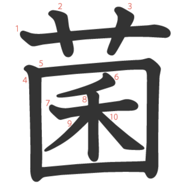 菌는 "창고(囗) 안의 곡식(禾)에 핀 곰팡이(艹)" -> "세균, 균"이라는 뜻의 글자입니다.