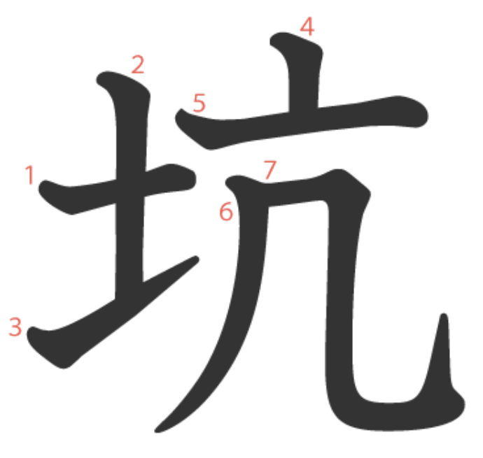 坑는 "흙(土) 구덩이를 기어오르다(亢)" -> "구덩이"라는 뜻의 글자입니다.
