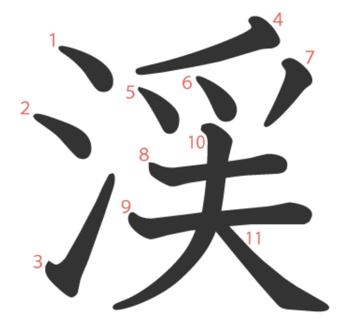 渓는 "계곡(氵)에서 물고기를 잡는(⺤) 성인 남성(夫)" -> "계곡, 골짜기"라는 뜻의 글자입니다.