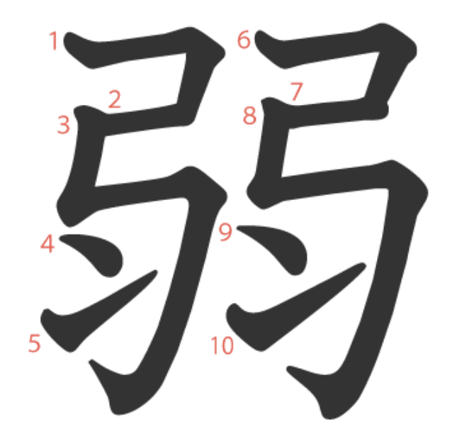 - 훈독 よわ(い)、よわ(る)、よわ(まる)、よわ(める)