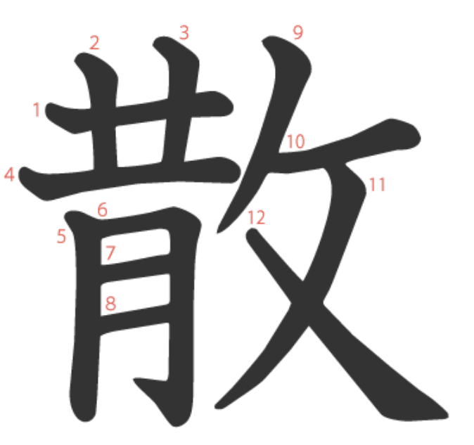 - 훈독 ち(る)、ち(らす)、ち(らかる)、ち(らかす)