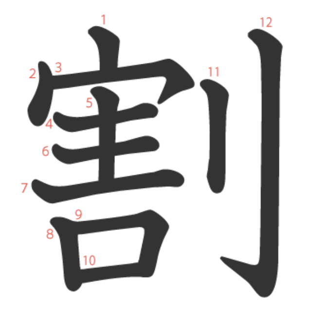 - 훈독 わ(る)、わり、わ(れる)、さ(く)