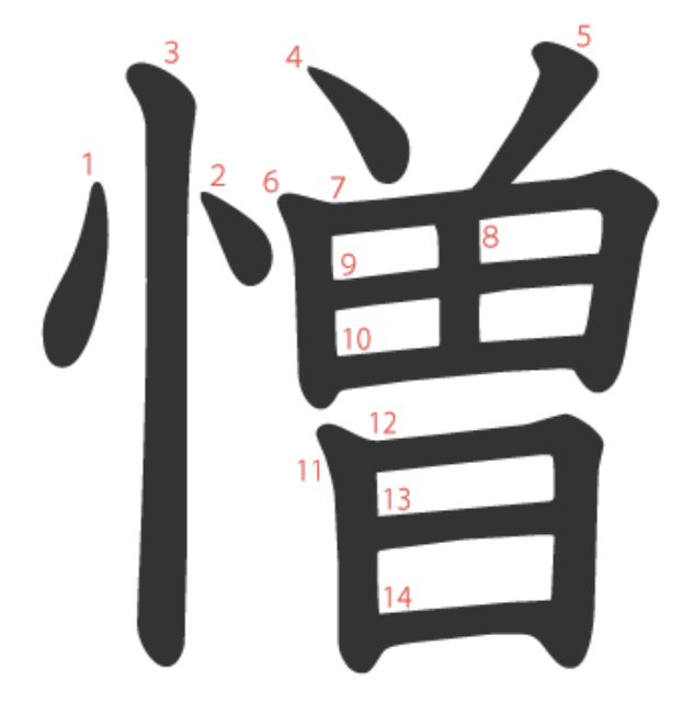 - 훈독 にく(む)、にく(い)、にく(らしい)、にく(しみ)