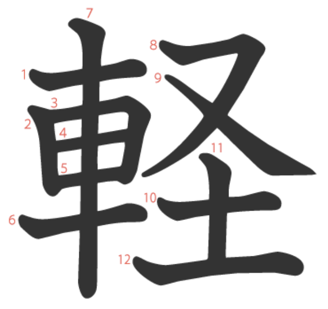 軽는 "마차(車)가 가볍게 지나가다(圣)" -> "가볍다"라는 뜻의 글자입니다.