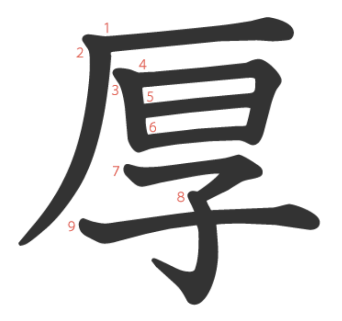 - コウ 深厚 심후, 濃厚 농후, 厚意 후의, 厚生 후생