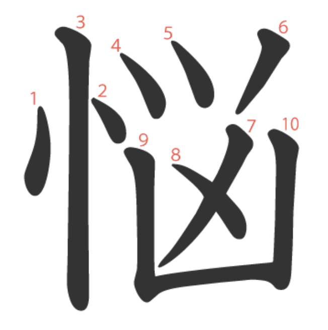 悩 = 忄 + ⺍ + 凶。