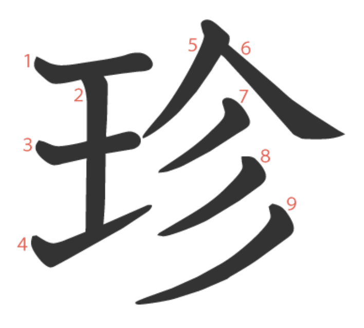 珍는 "반짝반짝 윤기가 흐르는(㐱) 옥구슬(𤣩)" -> "진귀한, 흔치 않은"이라는 뜻의 글자입니다.