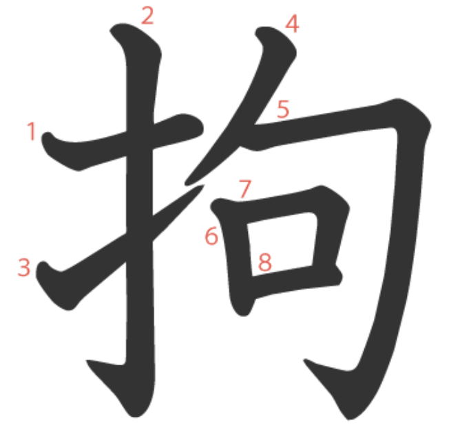 拘는 "손(扌)으로 붙잡다" -> "붙잡다"라는 뜻의 글자입니다(句는 소리부).