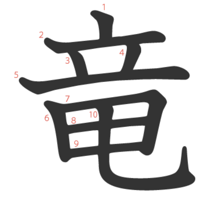 竜는 "번개(电)가 치는 하늘 위에 우뚝 선(立) 용" -> "용"이라는 뜻의 글자입니다.