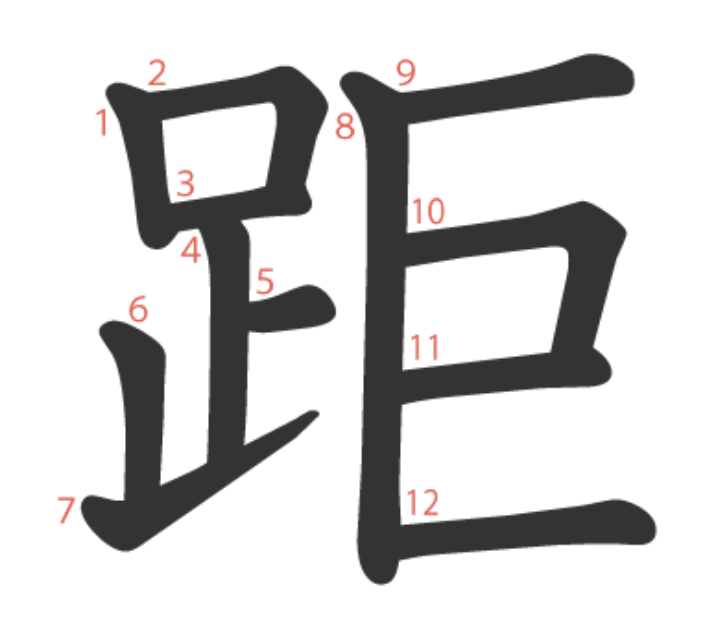 距는 "거대한(巨) 발(足)" -> "보폭이 크다" -> "멀리 떨어지다, 거리"라는 뜻의 글자입니다.