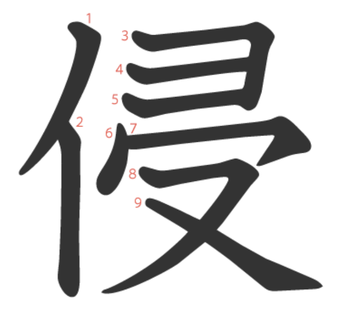 侵는 "빗자루를 휘둘러(𠬶) 침입자(亻)를 쫓아내다" -> "침범하다, 침해하다"라는 뜻의 글자입니다.