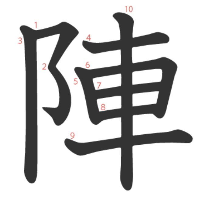 陣는 "언덕(⻖) 아래 늘어선 전차들(車)" -> "진, 진치다"라는 뜻의 글자입니다.