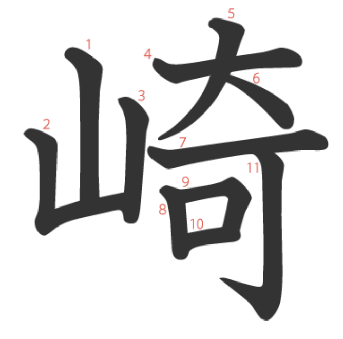 崎는 본래는 "곶"을 뜻하는 한자로, "산(山)"과 소리부(奇 - キ)가 합쳐져서 만들어진 글자입니다.
