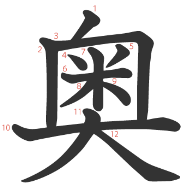 奥는 "집(宀) 안쪽 깊숙이 쌀(米)을 숨겨두고 지키는 사람(大)" -> "깊은, 안쪽"이라는 뜻의 글자입니다.
