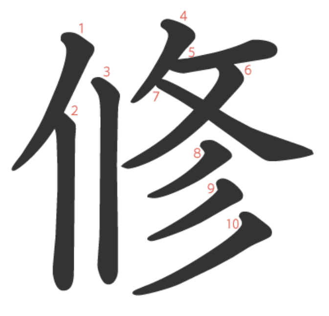 修는 "사람(亻)의 등(丨)을 채찍질하며(攵+彡) 단련시키다" -> "수행하다, 수양하다"라는 뜻의 글자입니다.