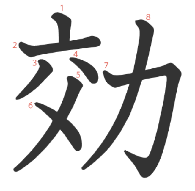 効는 "약효(力)가 몸에 스며들다(交)" -> "효과, 효능, 효율"이라는 뜻의 글자입니다.