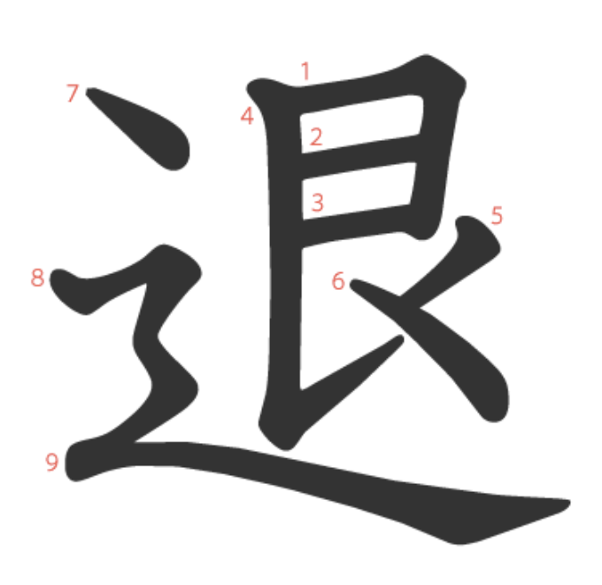退 = ⻌ + 艮。