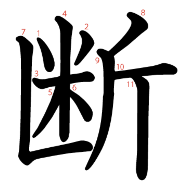 断는 "엉켜 있는 실뭉치(𠃊+米)를 도끼(斤)로 끊다" -> "끊다, 결정하다"라는 뜻의 글자입니다.