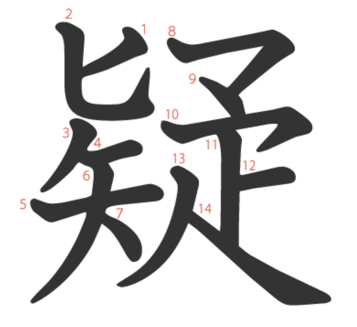 疑는 "칼(匕)과 화살(矢)을 든 어린아이(マ+疋)"라는 뜻입니다.