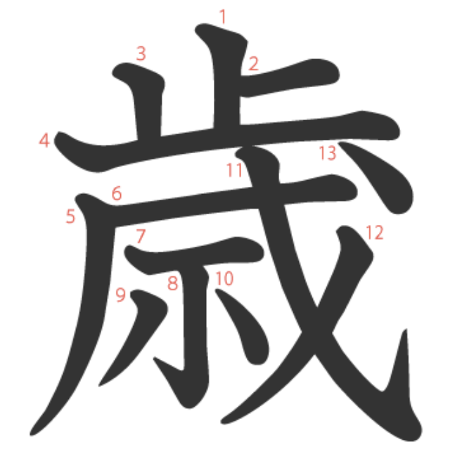 歳는 "전쟁터에서 창을 들고(戌) 싸우며 걸어온(歩) 세월들" -> "해, 나이"라는 뜻의 글자입니다.