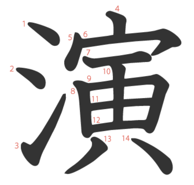 演 = 氵 + 宀 + 一 + 由 + ハ。