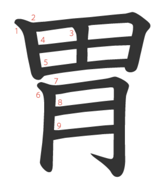 胃는 "사람의 위(田) + 신체의 일부(月)" -> "위"라는 뜻의 글자입니다.