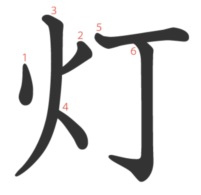 灯는 "등잔(丁)의 불빛(火)" -> "등, 등잔"이라는 뜻의 글자입니다.