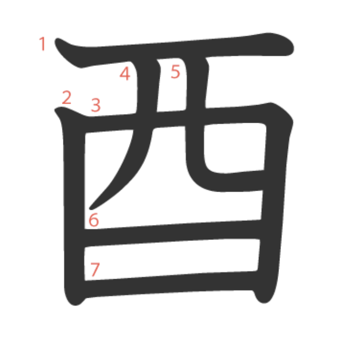 酉 = ⺎ + 口 + 一。