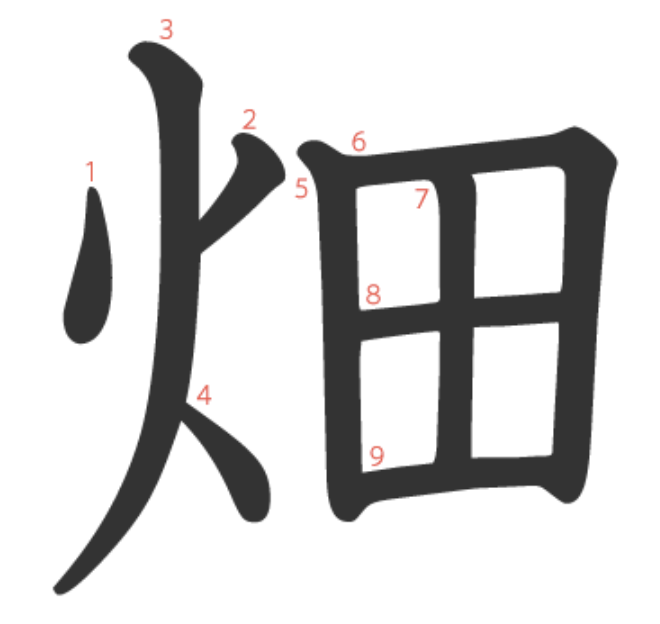 畑는 "산을 태워서(火) 만든 화전(田)" -> "밭"이라는 뜻의 글자입니다.