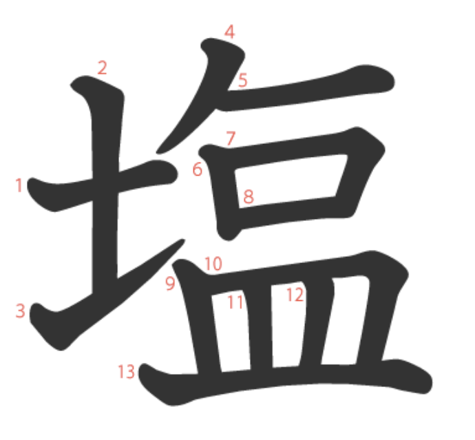 塩는 "소금(土)이 담긴 그릇(皿)과 뚜껑(𠂉 + 口)" -> "소금"이라는 뜻의 글자입니다.