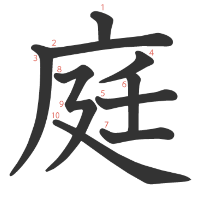 庭는 "저택(广) 안의 뜰을 휘적휘적 걷는(廴) 사람(壬)" -> "정원, 뜰, 마당"이라는 뜻의 글자입니다.