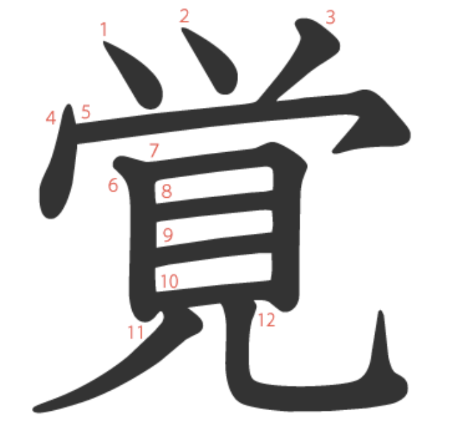 - 의미 "깨달을 각". 깨닫다, 눈뜨다, 기억하다