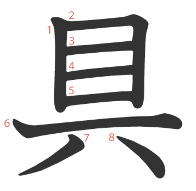 具 = 目 + 一 + ハ。