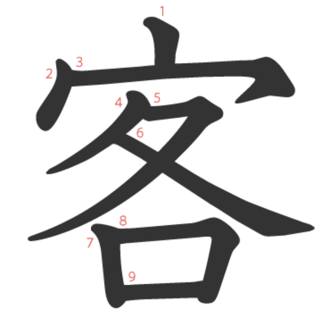 客는 "집(宀)에 들어온(各) 손님" -> "손님"이라는 뜻의 글자입니다.