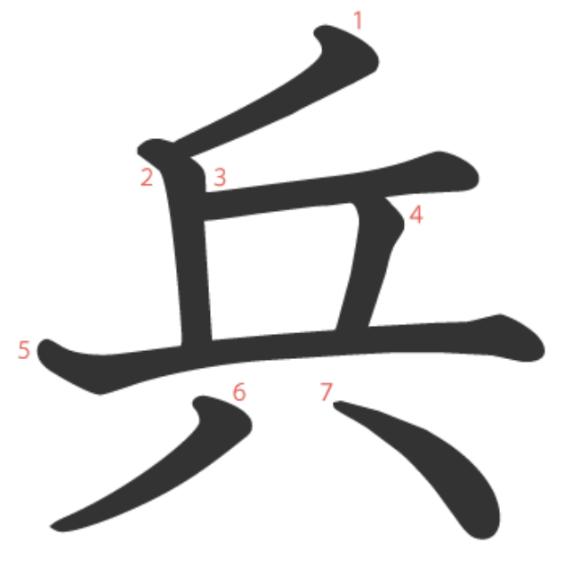 兵는 "도끼(斤)를 하늘 높이 치켜든(一+ハ) 병사" -> "병사"라는 뜻의 글자입니다.