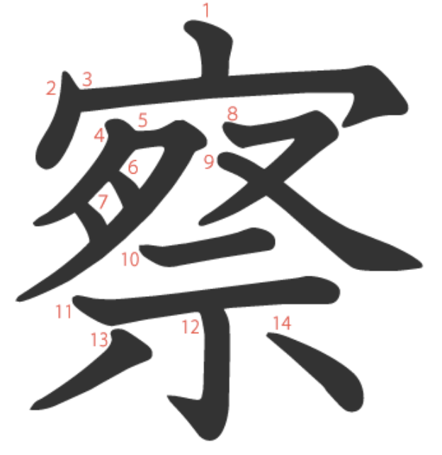 - サツ 観察 관찰, 考察 고찰, 察知 찰지(헤아리다)