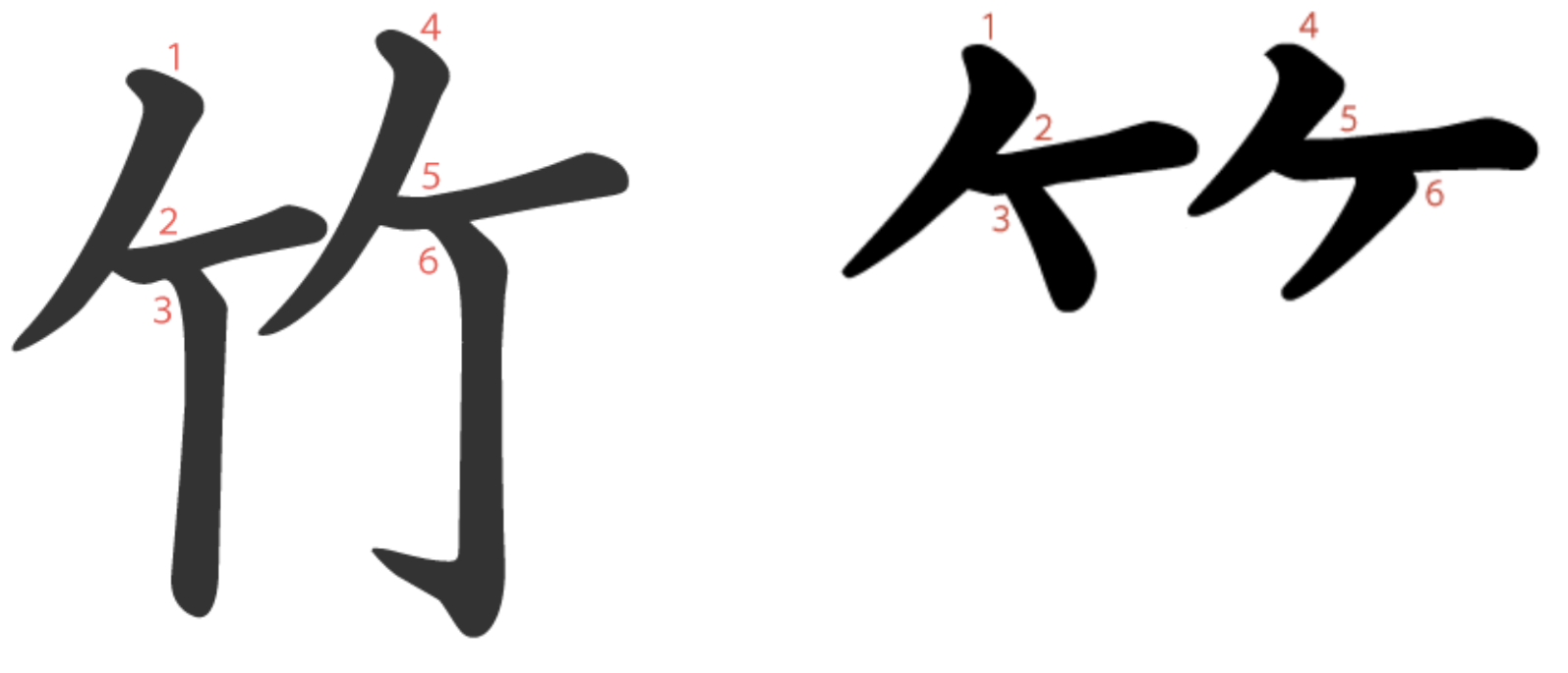 竹는 "대나무 줄기와 잎사귀"를 그린 상형문자입니다.